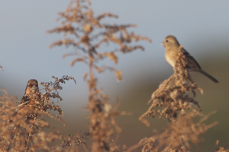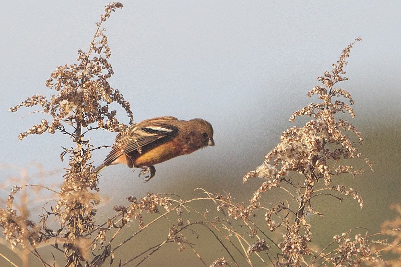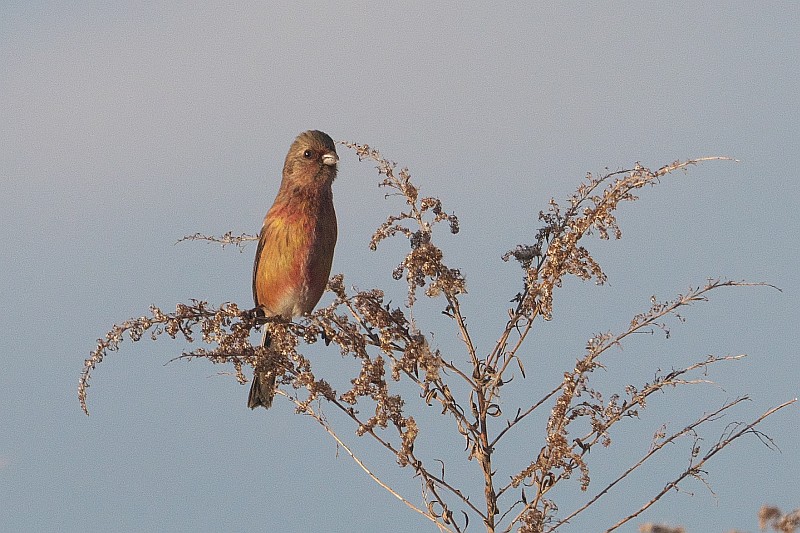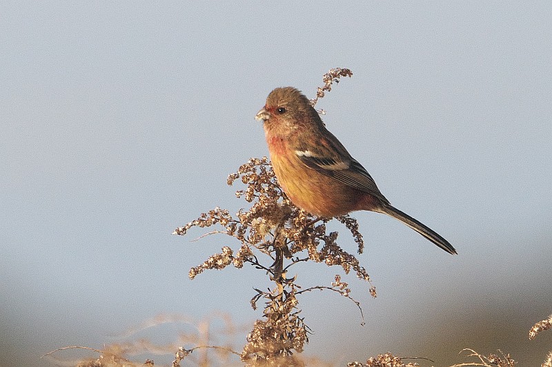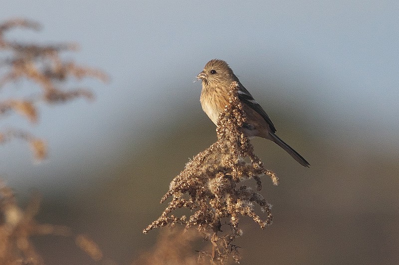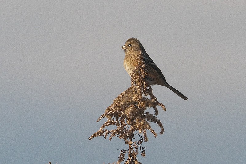 そして、雑草の天辺に止まっている小鳥を発見、アオジは天辺には止まりません。 待望のベニマシコでした。♪