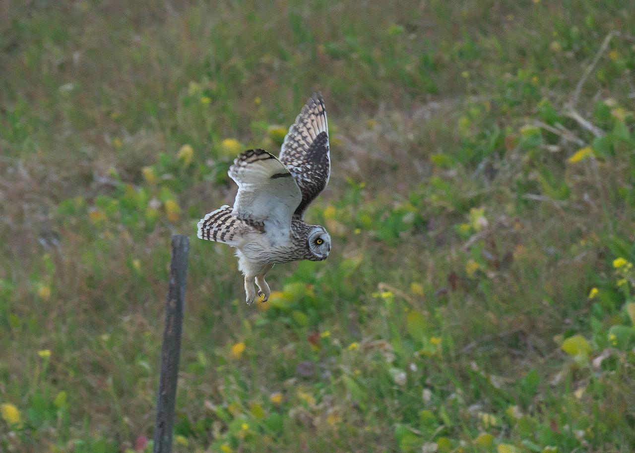 杭に止まったコミミズク、しっかりこちらを見つめていますね。