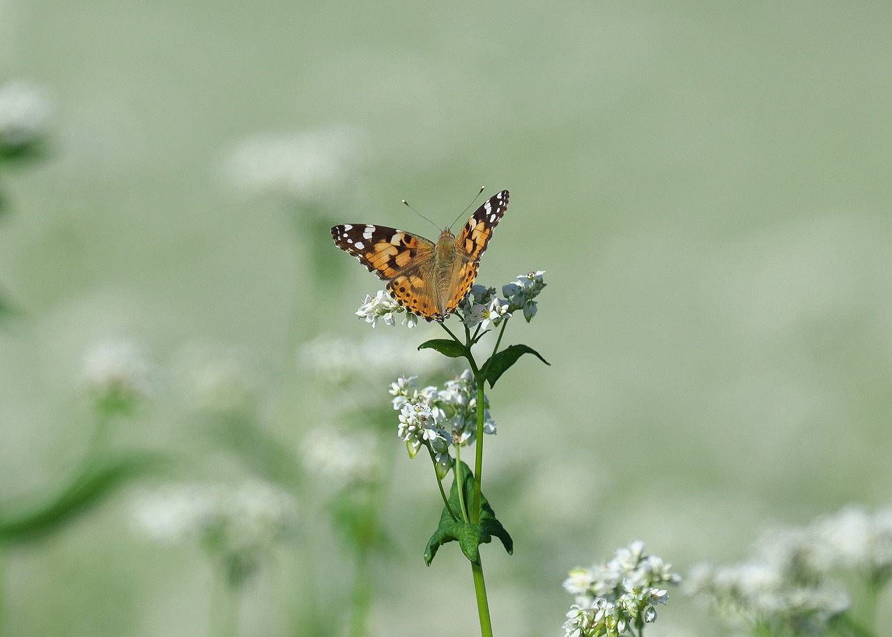 そして蕎麦の花に止まってくれたのはヒメアカタテハでしたか。