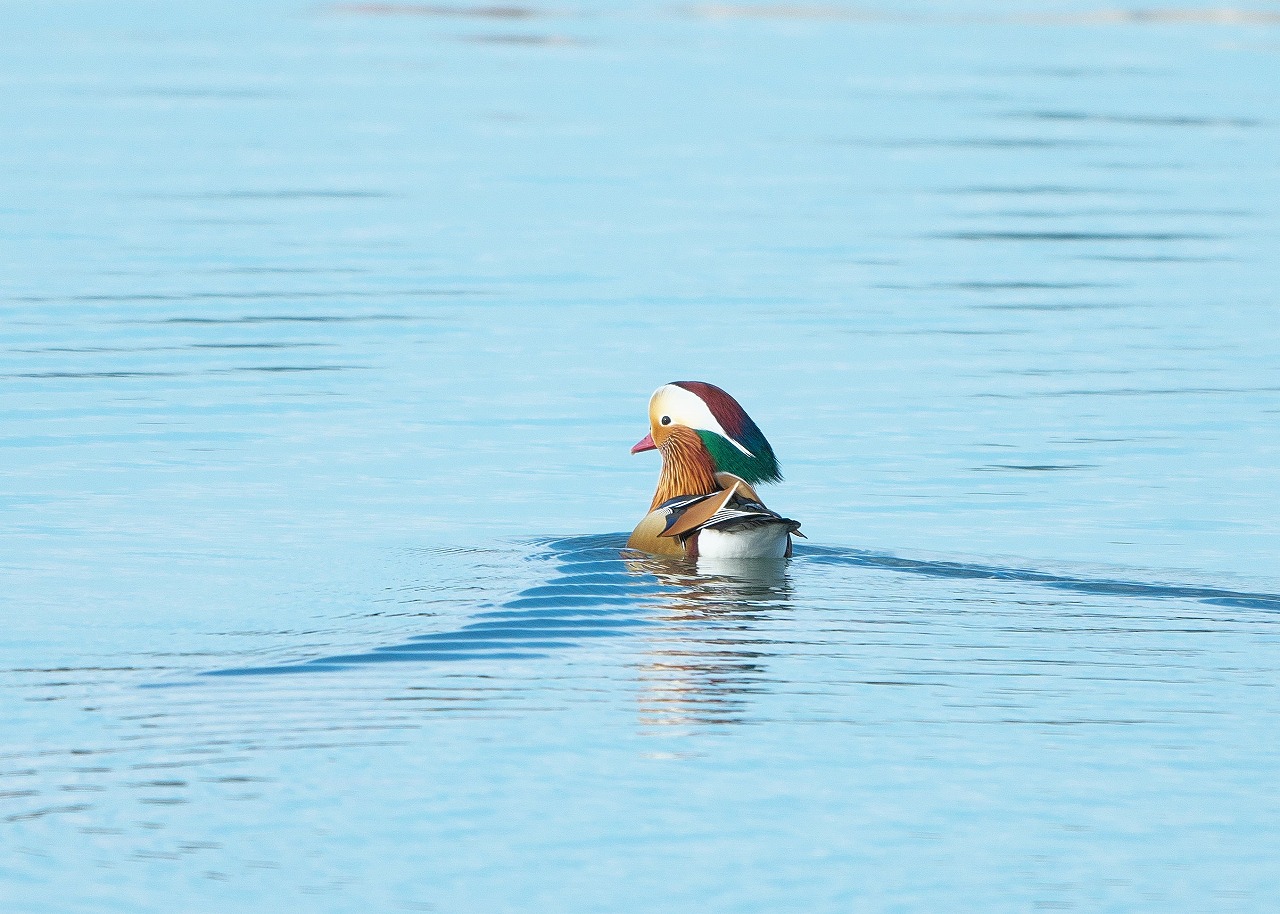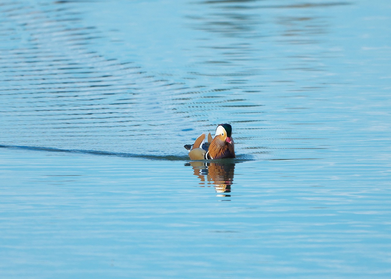 綺麗な水面をオシドリ♂が悠然と進んでいますね。