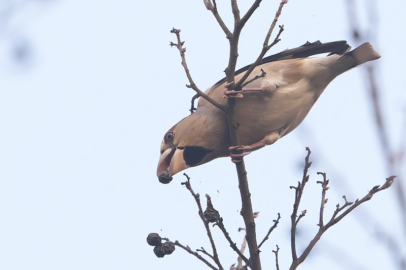 カワセミを撮っていると、頭上の樹木にシメが黒い実を食べていたので、撮りました。