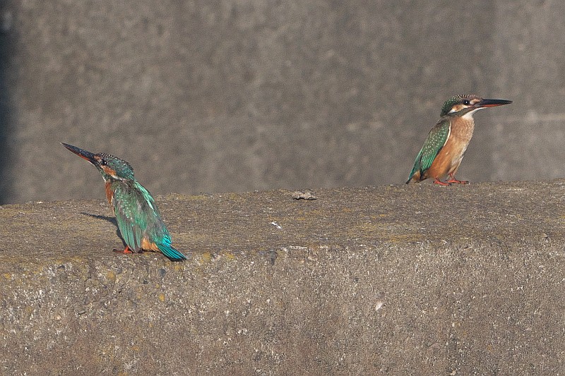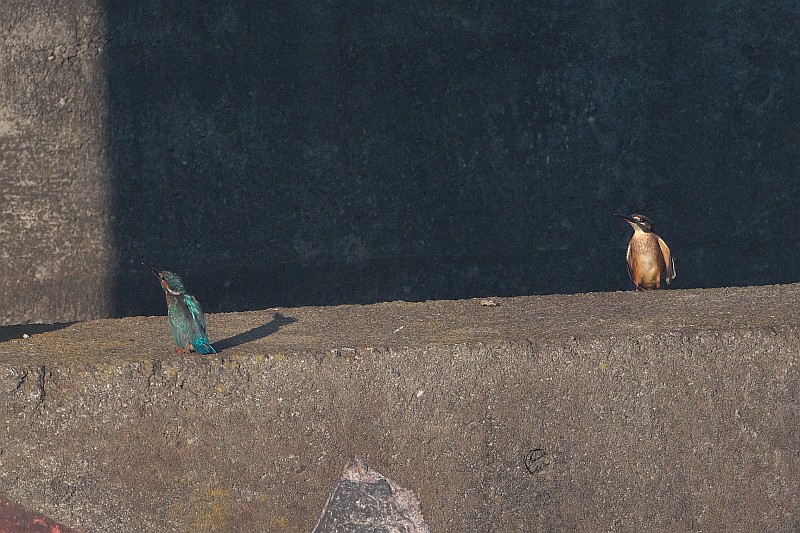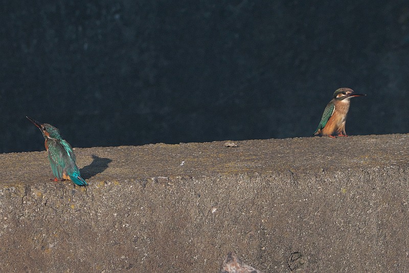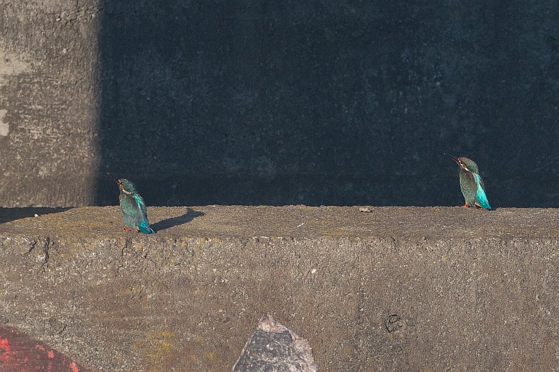 次にいつもの川に行ってみたところ、堰のお立ち台にカワセミが2羽並んでいました。