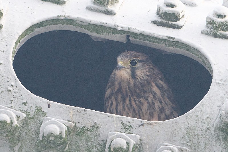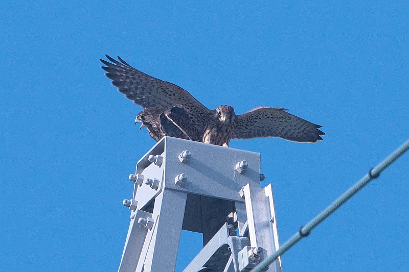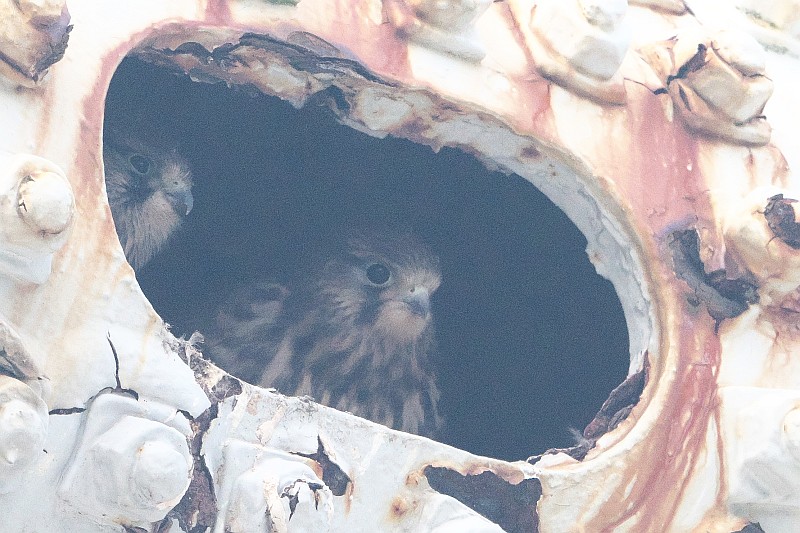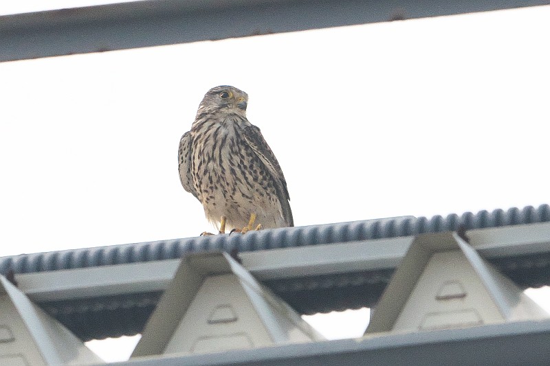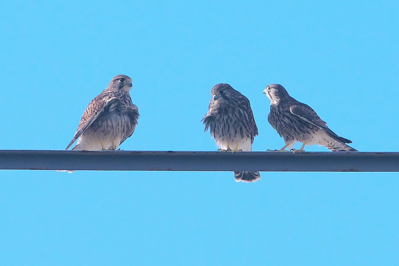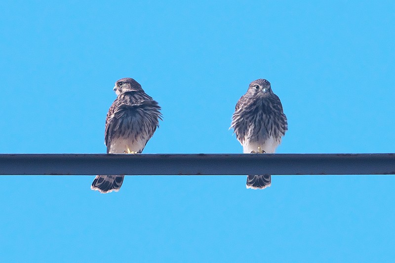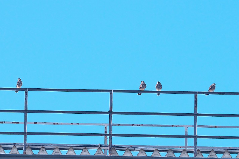 なので、短時間で撤収し、近くのチョウゲンボウの様子を見に行きました。 チョウゲンボウの幼鳥ですが、水道橋の手すり?に並んでいたので、順光側から撮りました。