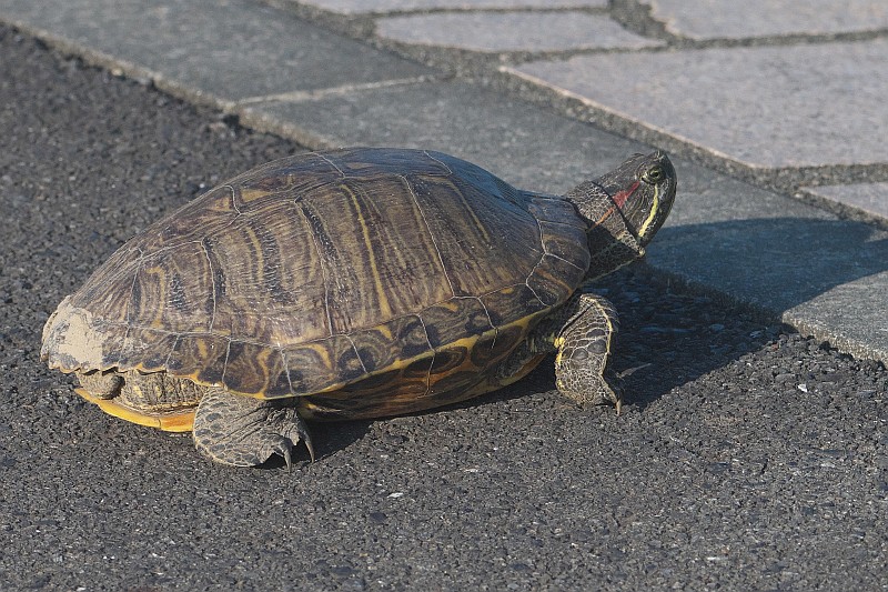 本日のアカミミガメ。 なぜこんなところに居るのか不可思議です。 通りがかった子供が亀を池に放してくれました。