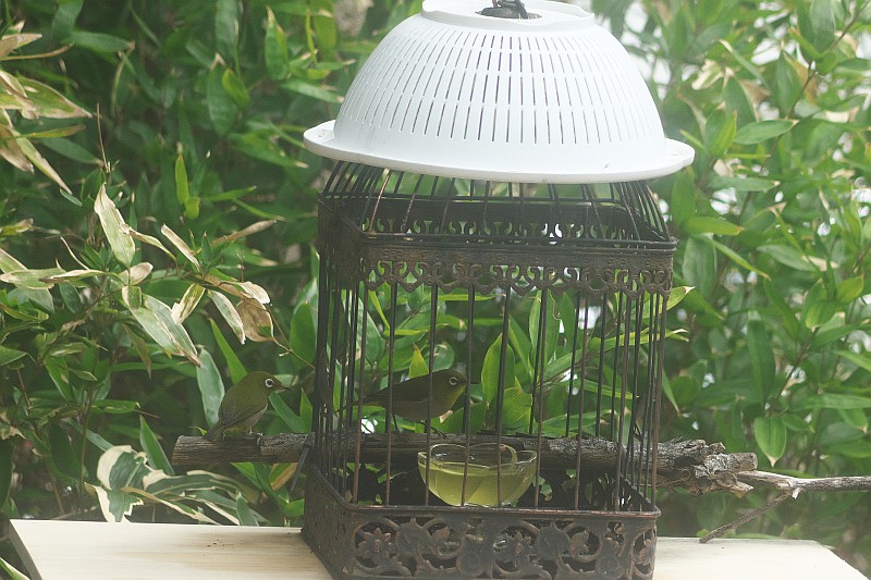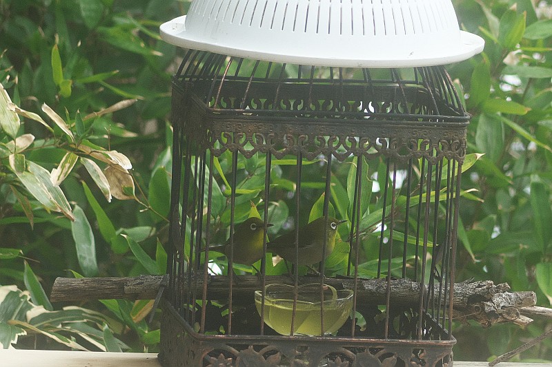 本日の庭撮りから、屋根付きのレストランに来たメジロ。