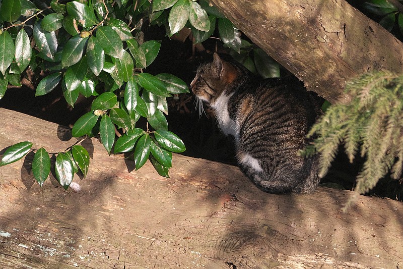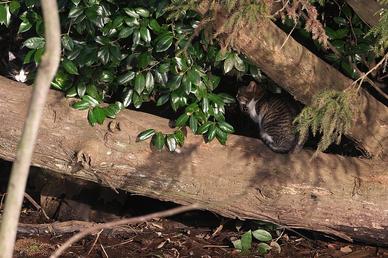 他にシジュウカラとアカハラ♀を撮ったのですが、鳥さんが水浴びや水飲みにやって来る奥の倒木にネコが居ました。