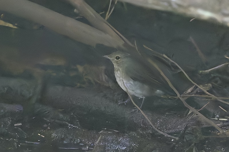 奥の水場にキビタキ♀が一瞬姿を現したのですが、暗くて証拠写真でした。