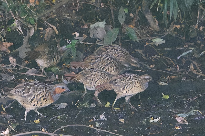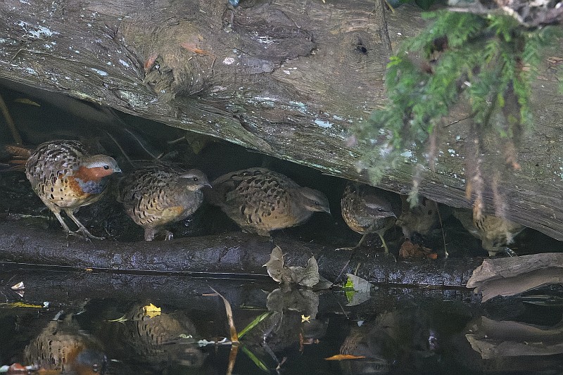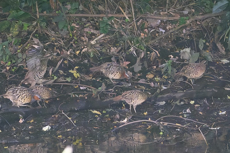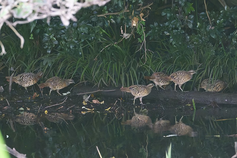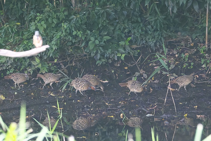 そしてカワセミを撮っていると、その背後に突然コジュケイ一家が通り過ぎました。